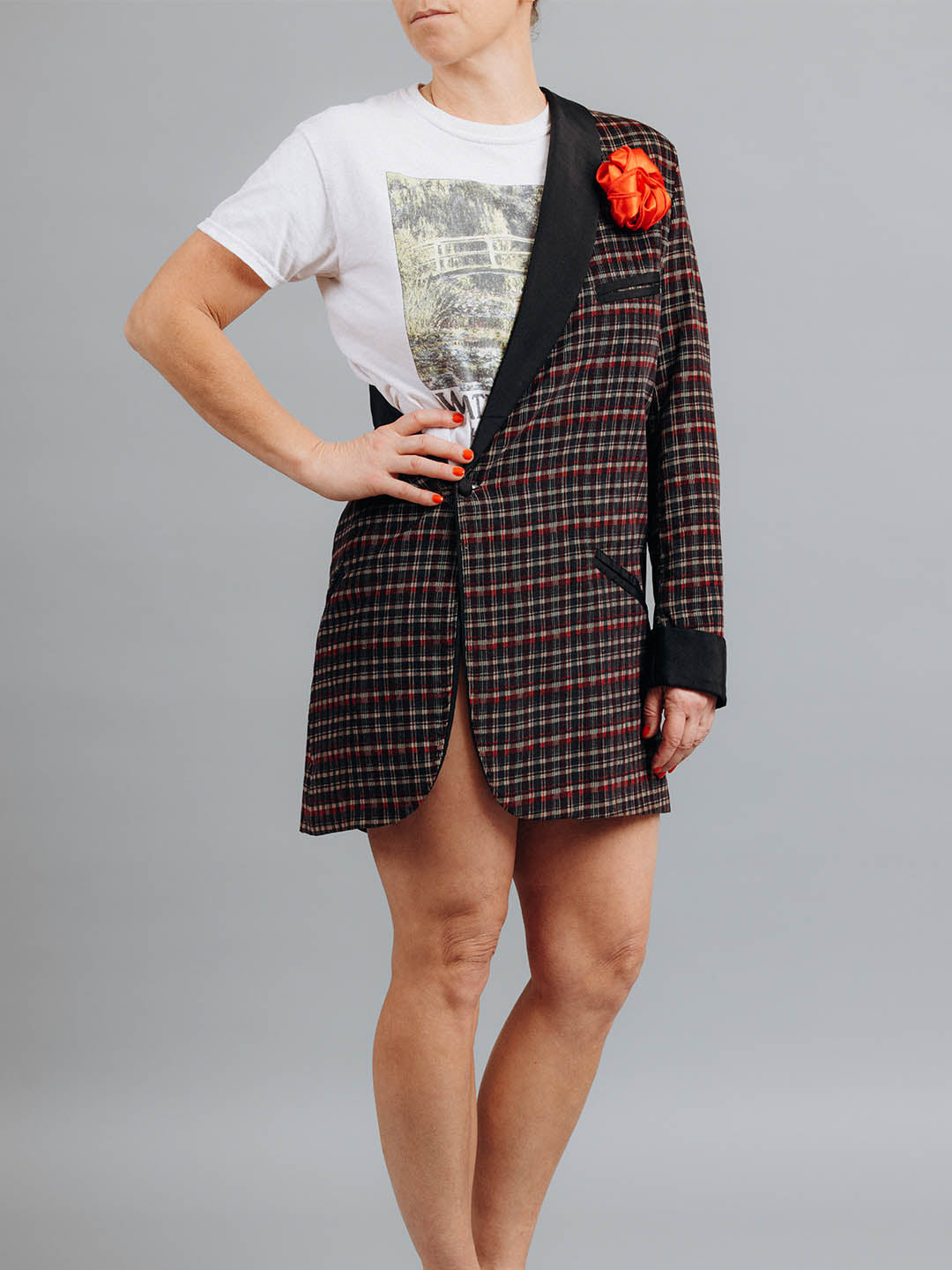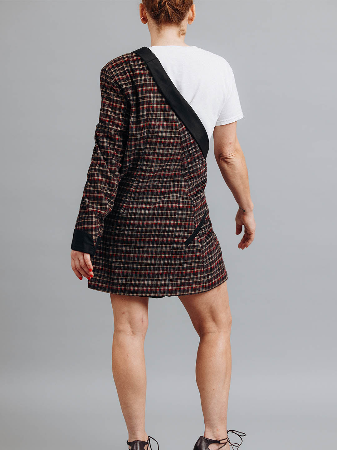 The baby sister to the 4-in-1 Tuxedo Set. Upon the completion of the collection, it was simply a right of passage for Nina to have her very own asymmetrical tux dress to wear on her birthday; hence the name of the piece, "The Birthday Suit". This one's for the party girls with a purpose.
