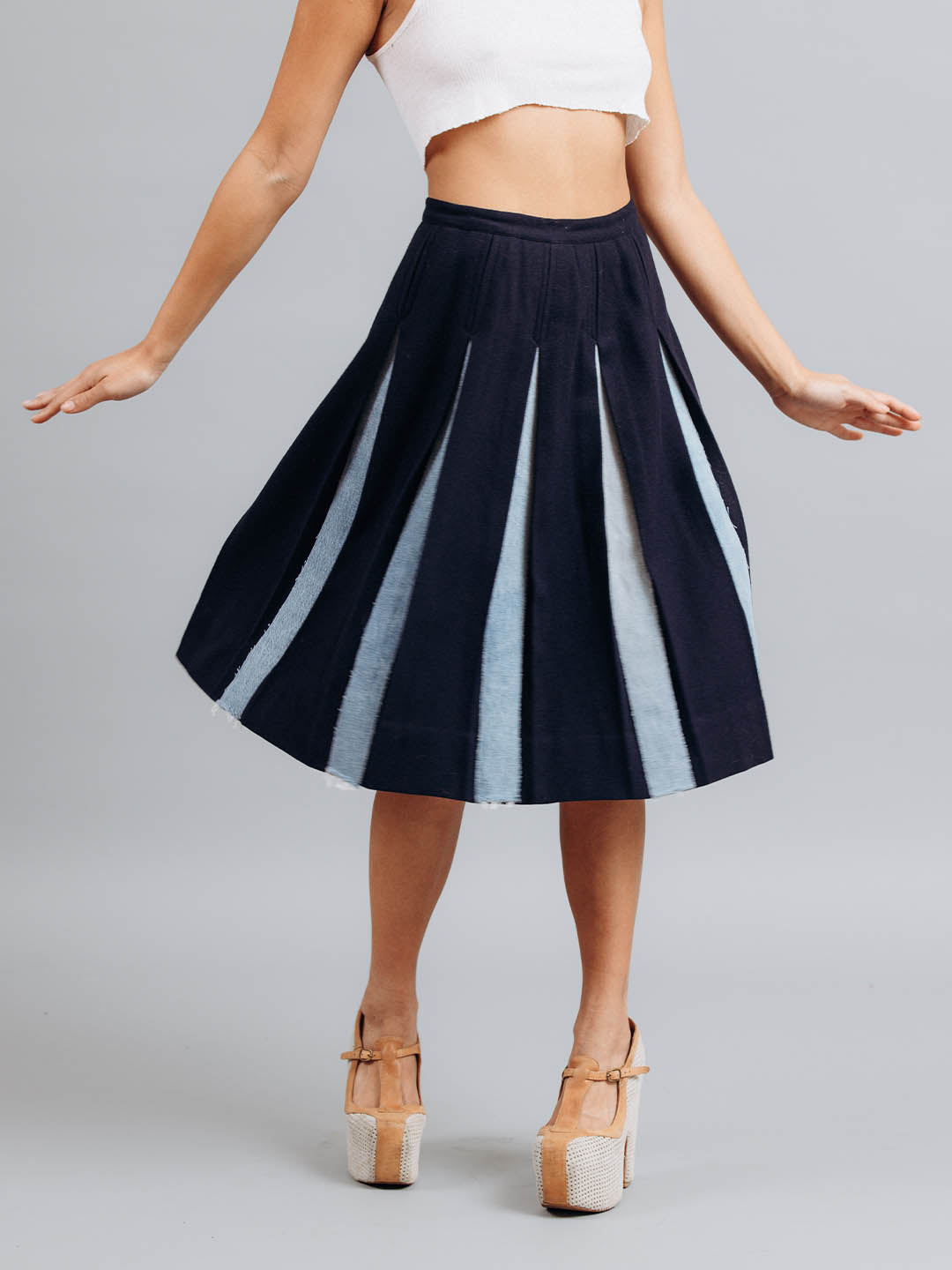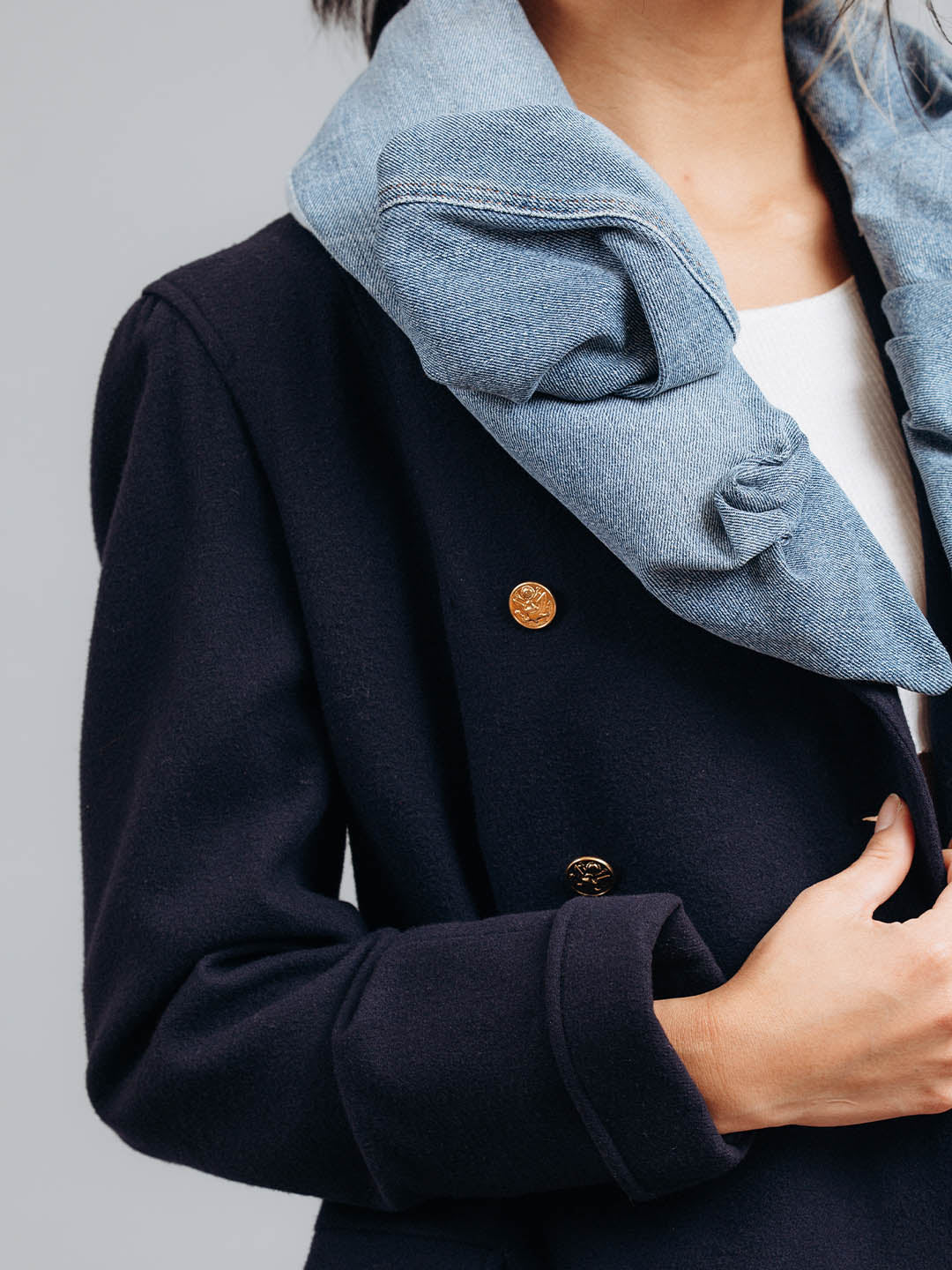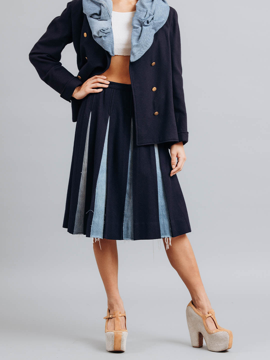 Grandma Grace, affectionately known as GG, epitomized timeless style throughout her lifetime. A cherished friend and profound source of inspiration to Nina, GG generously gifted her this navy peacoat and skirt ensemble. While the enduring appeal to a suit like this is undeniable, we RE:touched it with some of Nina's vintage Levi's denim, adding a touch of intrigue and flair.