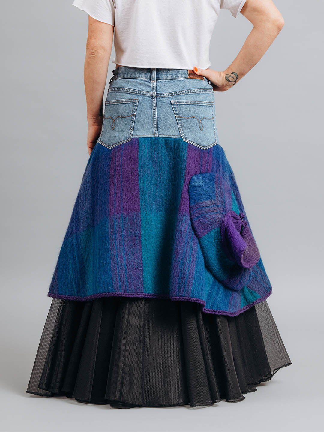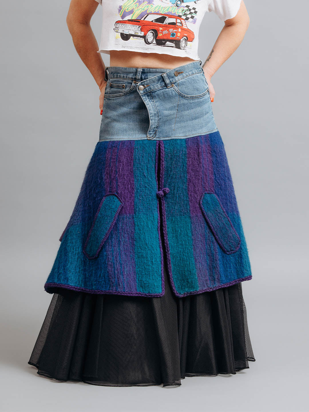 Alexander McQueen famously said, “Demolish the rules, but keep the tradition.” While this sentiment resonates deeply throughout the entire collection, it is especially relevant to the construction of this skirt. A cape RE:imagined as the middle tier of this skirt and a petticoat utilized for additional volume but - to the tune of demolishing the rules - visible. This skirt is definitely a showstopper.