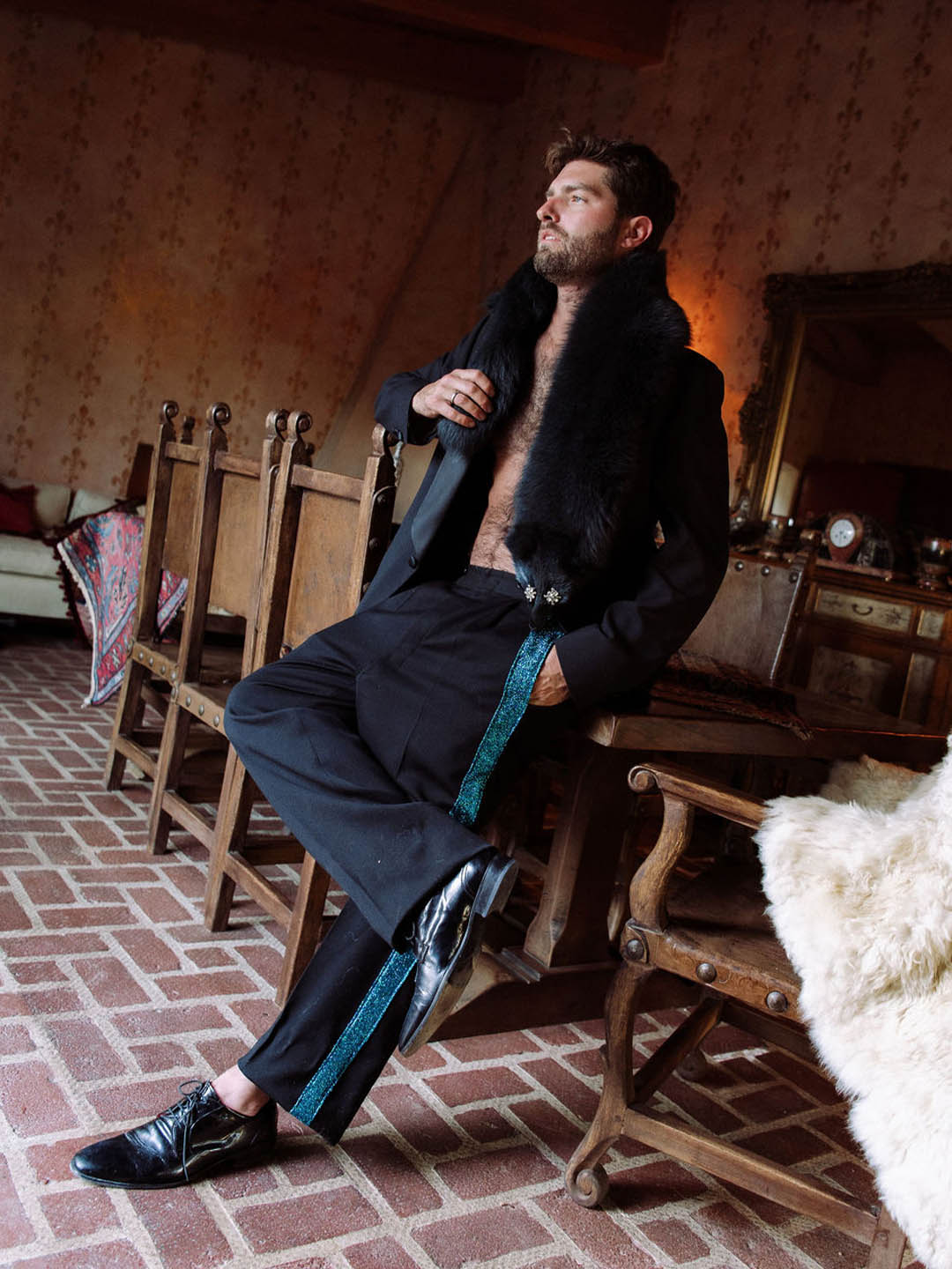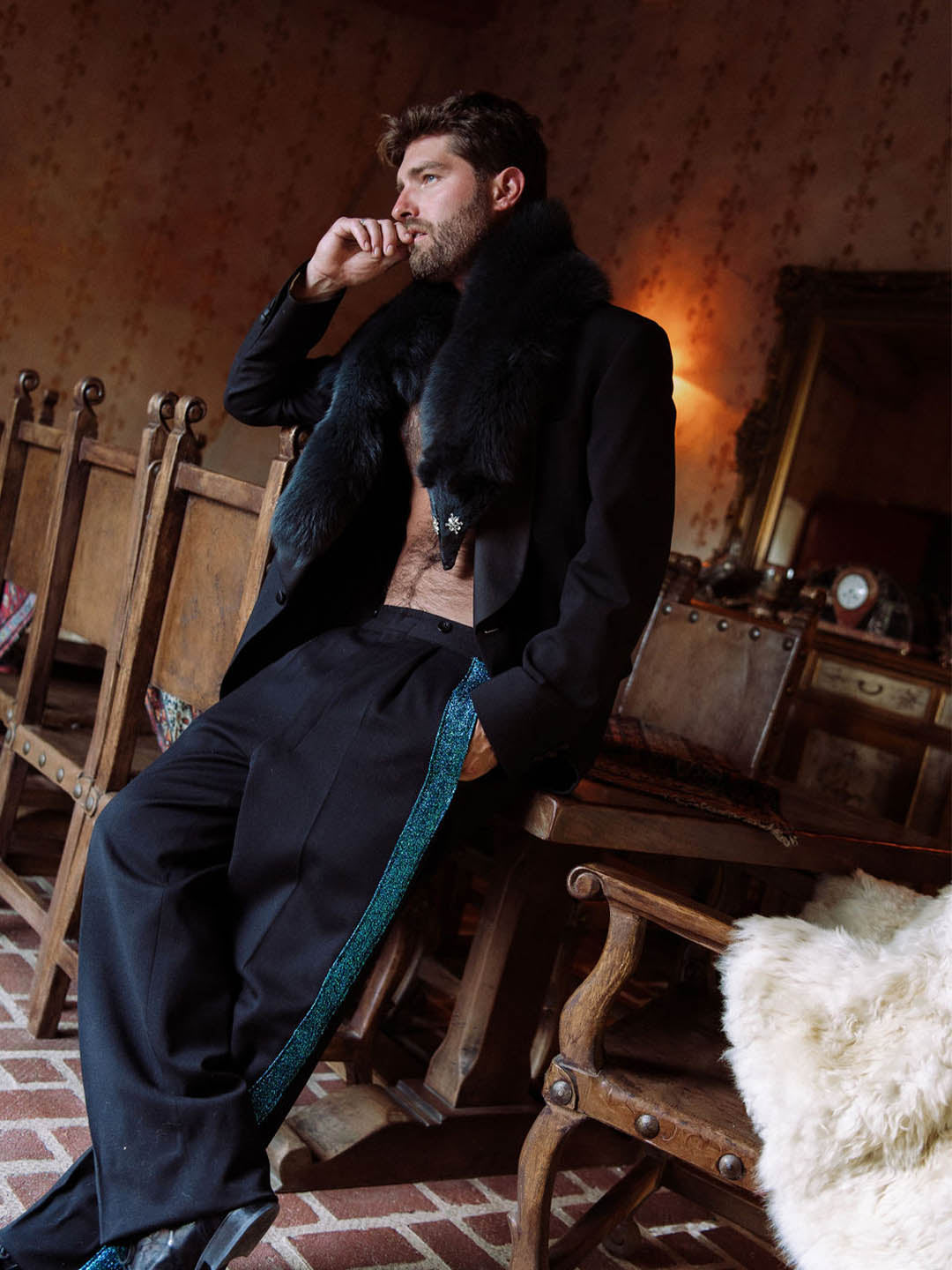 The tuxedo remains a symbol of elegance, formality, and timeless style, synonymous with special occasions and black-tie events. Its enduring popularity and versatility in men's formal attire reflect its ability to transcend fashion trends and cultural shifts, maintaining its iconic status across generations. We're celebrating the importance of such regality by adding a touch of shimmery blue lamé to the trouser and a matching cummerbund.