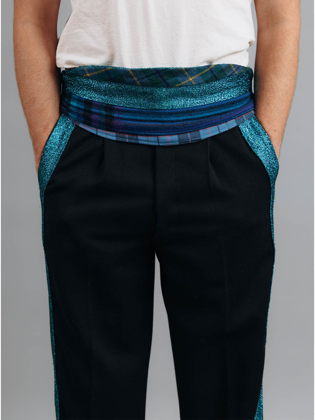 - Multi-fabric cummerbund made of fabric remnants from the collection