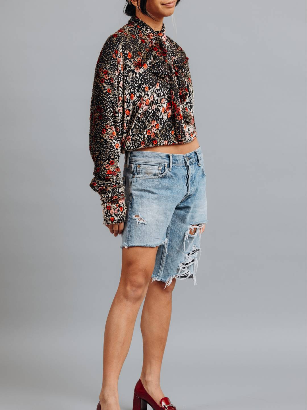Originally a mid-rise, distressed denim pant, this is another take on our asymmetrical Party Short.